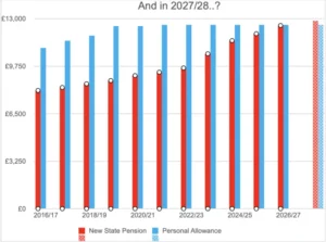 The income tax personal allowance is £12,570, as it has been since 2021/22. Given that the minimum State pension increase is 2.5%, and the personal allowance is frozen until at least 2028/29, this means that from April 2027, the new State pension will exceed the personal allowance and, all other things being equal, attract a small income tax liability.