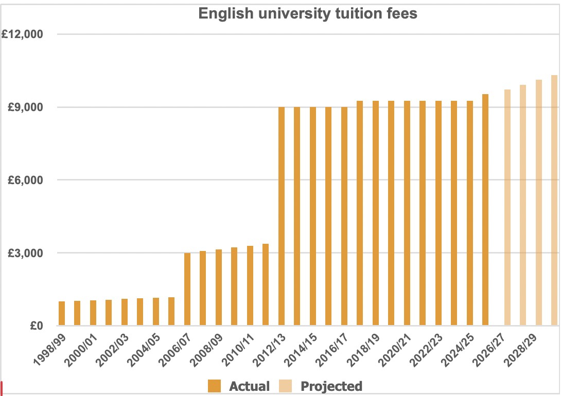 Even if inflation averages a relatively modest 2%, projections suggest that by the 2028/29 academic year, tuition fees in England will exceed £10,000 per year — ten times their original level when fees were introduced in 1998/99.